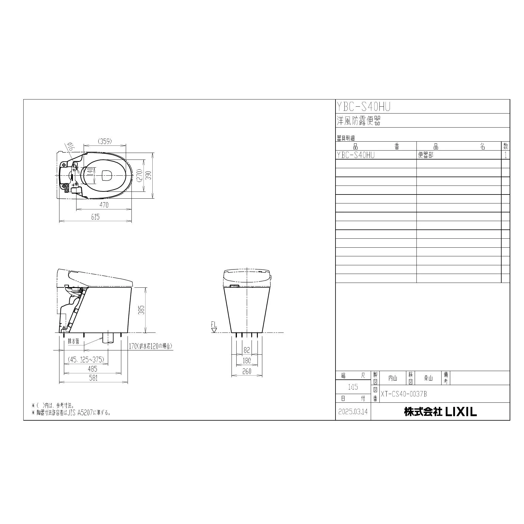 LIXIL(リクシル) YBC-S40HU 商品図面 施工説明書