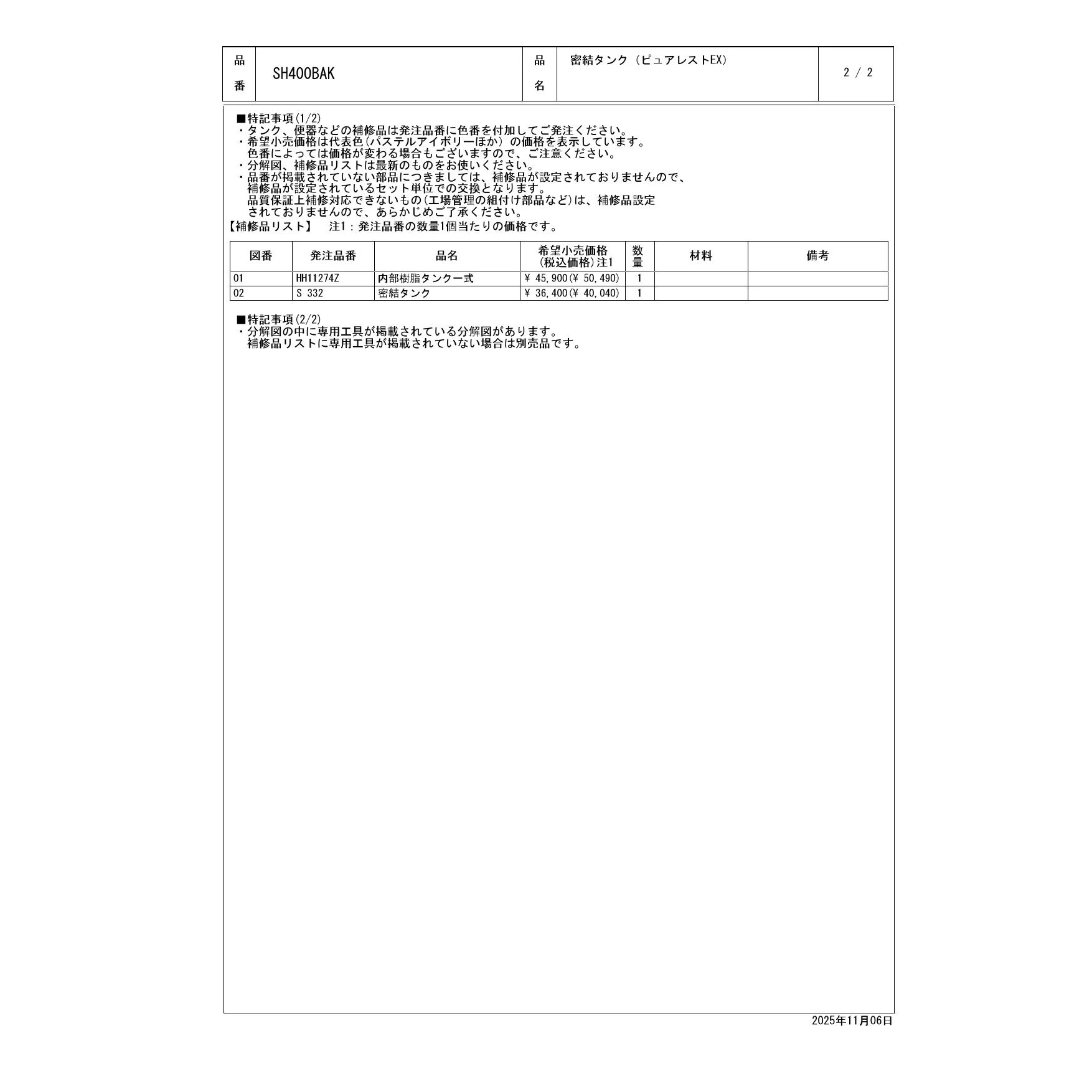 SH400BAK 密結タンク(ピュアレストEX)取扱説明書