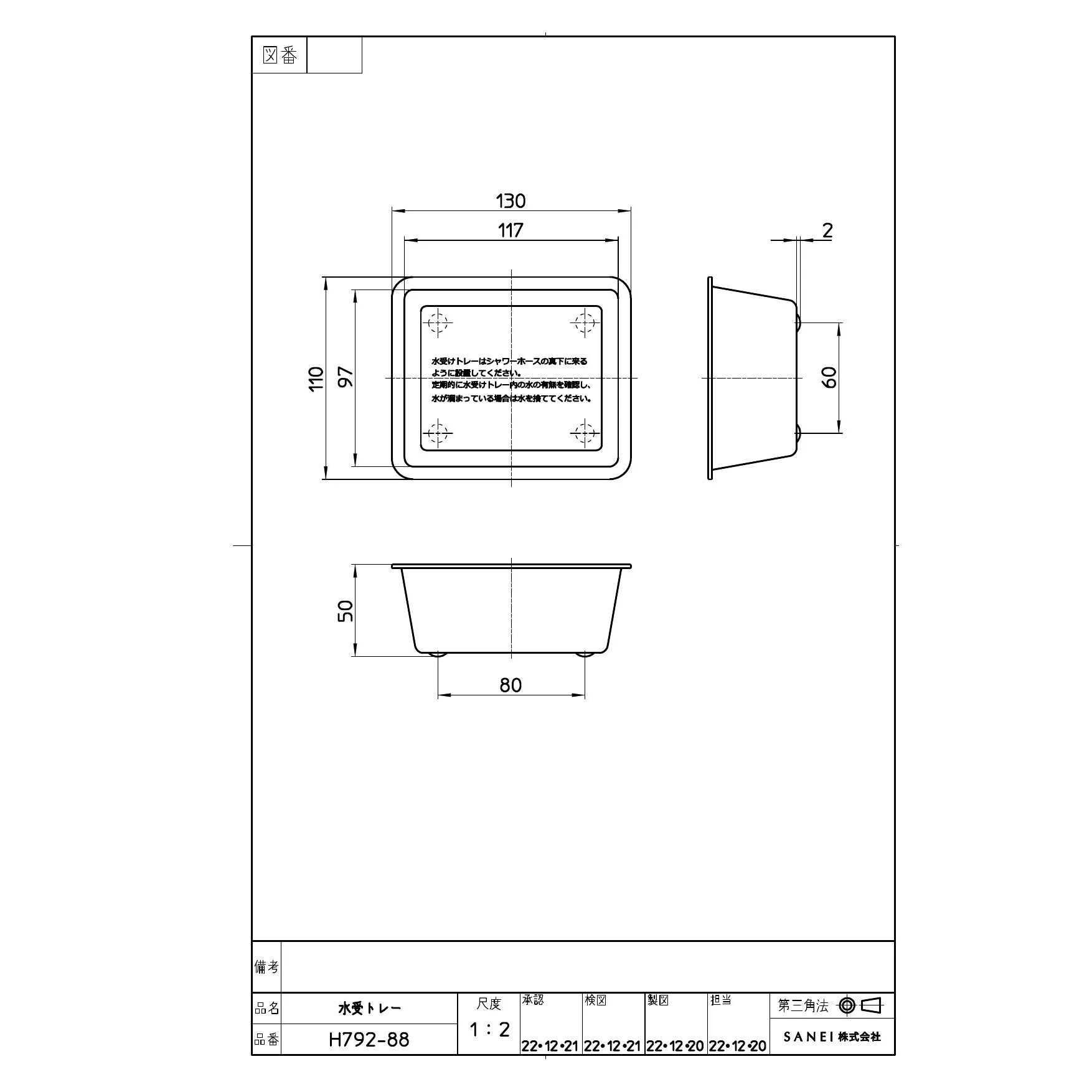 住宅設備のプロストア ダイレクト ホーム SANEI (サンエイ) 洗面用品 水受容器 H792-88 図面・説明書 SANEI H792-88 商品図面 各種図面のご利用については 免責事項をご確認の上ご利用ください。 H792-88 SANEI(サンエイ) 水受トレー 20.0%OFF 価格 ¥264 商品図面 このデータは2025年12月 現在のものです。 商品図面の一括ダウンロード SANEIカスタマーセンター SANEIお問い合わせ SANEIトップページフリーダイヤル:0120-06-9721 受付時間:月~金 9:00~17:00(土日祝、夏季休暇、年末年始を除く) ダイレクトが選ばれる理由 プロストア ダイレクトは、一流メーカー住宅設備機器のトイレ・水栓・給湯器などを卸値価格で販売している会社です。 リフォームに携わる毎日忙しいお客様(一人親方の業者様や工務店様、マンションの管理をしている方)の時間コストを圧縮する(手早くご購入できる)ために、取扱商品35,000点、在庫商品2,300点以上の品揃え!商品仕様などの情報源も支援出来る様なショップを目指しております。 住宅設備機器でお悩みの方は プロストアダイレクトにご相談ください! また、土日、祝祭日、年末年始、夏季期間は翌営業日以降の対応となりますのでご了承ください。 お問い合わせフォーム 平日10時までの注文で在庫商品なら当日発送! SANEI (サンエイ) 洗面用品 水受容器 ご利用ガイド キャンセルについて ご注文後のキャンセルは一切承りかねます。品番ご確認の上ご注文ください。 送料について 通常配送料全国一律870円!お買い上げ合計30,000円以上で、通常配送料無料! お支払いについて 代金引換・銀行振込・3Dセキュア対応のクレジットカードがご利用頂けます。 荷受け時の注意事項 荷受け時に必ずお届けの品番とご注文品番に相違がないかをご確認ください。 お届けについて 当店在庫商品の場合、AM10:00までのご注文(ご入金確認)にて当日発送。 返品・交換について 商品の相違や不足が認められる場合、到着後7日以内にご連絡ください。 全商品メーカー保証あり 当店の取り扱い商品は、メーカー正規品の新品につき、メーカー保証が適用されております。 営業日・営業時間について 10:00~18:00(土日祝除く)。時間外のお問合せ・御注文は翌営業日より順次対応。 SSLについて 当店を安心してご利用していただける様、RapidSSLを導入しております。 商品検索 お探しの商品が見つからない場合は、商品名や品番よりお探し頂けます。 検索 住宅設備のプロストア ダイレクト ホーム SANEI (サンエイ) 洗面用品 水受容器 H792-88 図面・説明書 住宅設備のプロストア ダイレクト ホーム SANEI (サンエイ) キッチン 水受容器・包丁差し H792-88 図面・説明書