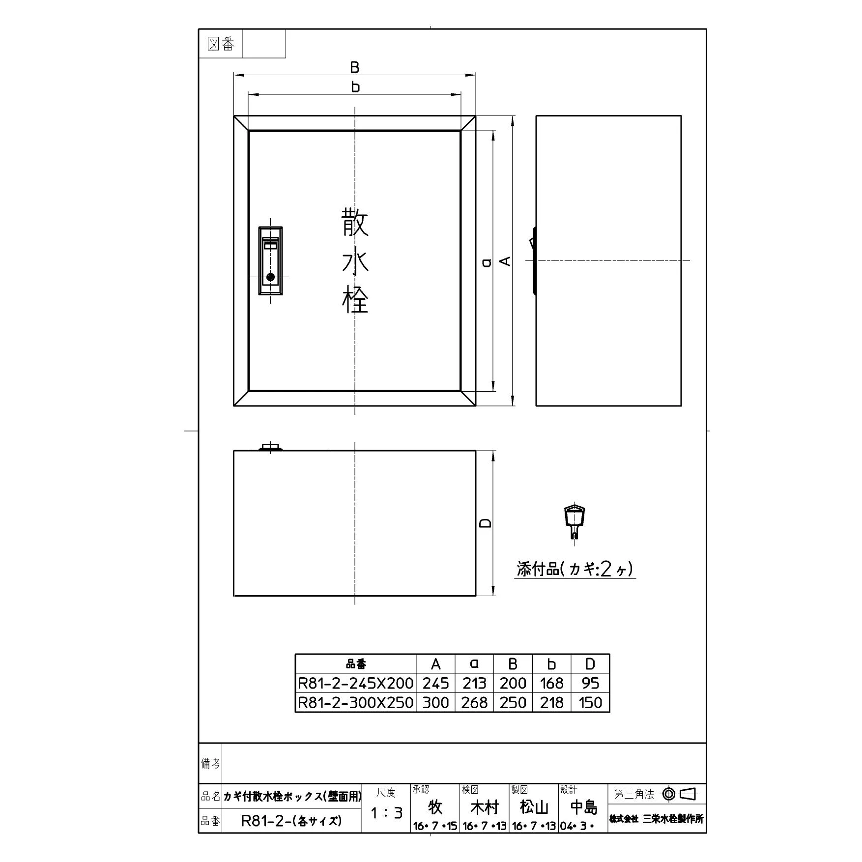住宅設備のプロストア ダイレクト ホーム SANEI (サンエイ) ガーデニング用品 散水栓ボックス R81-2-300X250 図面・説明書 SANEI R81-2-300X250 商品図面 各種図面のご利用については 免責事項をご確認の上ご利用ください。 R81-2-300X250 SANEI(サンエイ) カギ付散水栓ボックス(壁面用) 43.0%OFF 価格 ¥65,835 商品図面 このデータは2025年12月 現在のものです。 商品図面の一括ダウンロード SANEIカスタマーセンター SANEIお問い合わせ SANEIトップページフリーダイヤル:0120-06-9721 受付時間:月~金 9:00~17:00(土日祝、夏季休暇、年末年始を除く) ダイレクトが選ばれる理由 プロストア ダイレクトは、一流メーカー住宅設備機器のトイレ・水栓・給湯器などを卸値価格で販売している会社です。 リフォームに携わる毎日忙しいお客様(一人親方の業者様や工務店様、マンションの管理をしている方)の時間コストを圧縮する(手早くご購入できる)ために、取扱商品35,000点、在庫商品2,300点以上の品揃え!商品仕様などの情報源も支援出来る様なショップを目指しております。 住宅設備機器でお悩みの方は プロストアダイレクトにご相談ください! また、土日、祝祭日、年末年始、夏季期間は翌営業日以降の対応となりますのでご了承ください。 お問い合わせフォーム 平日10時までの注文で在庫商品なら当日発送! SANEI (サンエイ) ガーデニング用品 散水栓ボックス ご利用ガイド キャンセルについて ご注文後のキャンセルは一切承りかねます。品番ご確認の上ご注文ください。 送料について 通常配送料全国一律870円!お買い上げ合計30,000円以上で、通常配送料無料! お支払いについて 代金引換・銀行振込・3Dセキュア対応のクレジットカードがご利用頂けます。 荷受け時の注意事項 荷受け時に必ずお届けの品番とご注文品番に相違がないかをご確認ください。 お届けについて 当店在庫商品の場合、AM10:00までのご注文(ご入金確認)にて当日発送。 返品・交換について 商品の相違や不足が認められる場合、到着後7日以内にご連絡ください。 全商品メーカー保証あり 当店の取り扱い商品は、メーカー正規品の新品につき、メーカー保証が適用されております。 営業日・営業時間について 10:00~18:00(土日祝除く)。時間外のお問合せ・御注文は翌営業日より順次対応。 SSLについて 当店を安心してご利用していただける様、RapidSSLを導入しております。 商品検索 お探しの商品が見つからない場合は、商品名や品番よりお探し頂けます。 検索 住宅設備のプロストア ダイレクト ホーム SANEI (サンエイ) ガーデニング用品 散水栓ボックス R81-2-300X250 図面・説明書