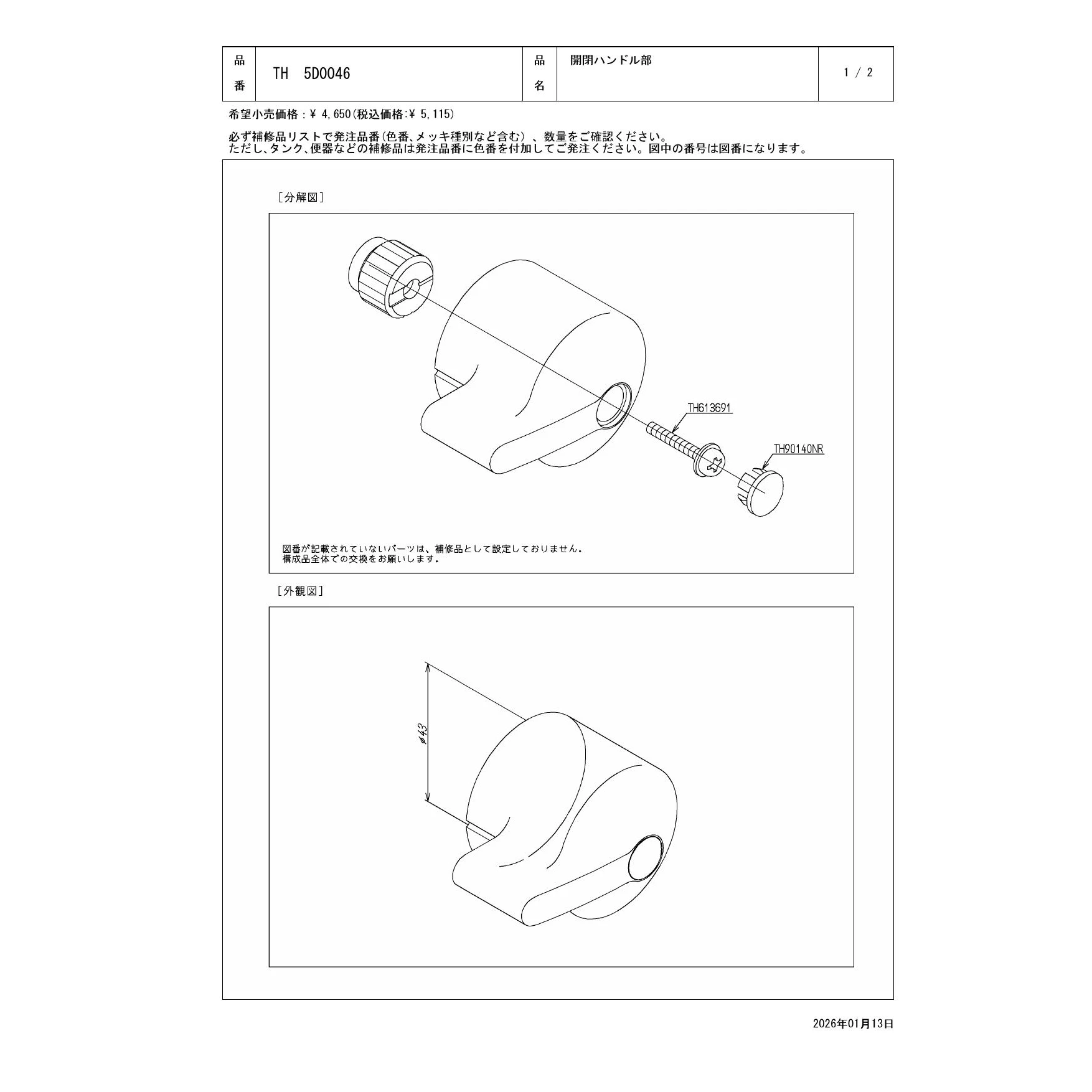 住宅設備のプロストア ダイレクト ホーム TOTO オプション・ホーム用品・シール材 水栓金具取り替えパーツ ハンドル TH5D0046 図面・説明書 TOTO TH5D0046 分解図 各種図面のご利用については 免責事項をご確認の上ご利用ください。 TH5D0046 開閉ハンドル部 10.0%OFF 価格 ¥4,604 分解図 このデータは2026年1月 現在のものです。 分解図の一括ダウンロード ダイレクトが選ばれる理由 プロストア ダイレクトは、一流メーカー住宅設備機器のトイレ・水栓・給湯器などを卸値価格で販売している会社です。 リフォームに携わる毎日忙しいお客様(一人親方の業者様や工務店様、マンションの管理をしている方)の時間コストを圧縮する(手早くご購入できる)ために、取扱商品35,000点、在庫商品2,300点以上の品揃え!商品仕様などの情報源も支援出来る様なショップを目指しております。 住宅設備機器でお悩みの方は プロストアダイレクトにご相談ください! また、土日、祝祭日、年末年始、夏季期間は翌営業日以降の対応となりますのでご了承ください。 お問い合わせフォーム 平日10時までの注文で在庫商品なら当日発送! TOTO オプション・ホーム用品・シール材 水栓金具取り替えパーツハンドル ご利用ガイド キャンセルについて ご注文後のキャンセルは一切承りかねます。品番ご確認の上ご注文ください。 送料について 通常配送料全国一律870円!お買い上げ合計30,000円以上で、通常配送料無料! お支払いについて 代金引換・銀行振込・3Dセキュア対応のクレジットカードがご利用頂けます。 荷受け時の注意事項 荷受け時に必ずお届けの品番とご注文品番に相違がないかをご確認ください。 お届けについて 当店在庫商品の場合、AM10:00までのご注文(ご入金確認)にて当日発送。 返品・交換について 商品の相違や不足が認められる場合、到着後7日以内にご連絡ください。 全商品メーカー保証あり 当店の取り扱い商品は、メーカー正規品の新品につき、メーカー保証が適用されております。 営業日・営業時間について 10:00~18:00(土日祝除く)。時間外のお問合せ・御注文は翌営業日より順次対応。 SSLについて 当店を安心してご利用していただける様、RapidSSLを導入しております。 商品検索 お探しの商品が見つからない場合は、商品名や品番よりお探し頂けます。 検索 住宅設備のプロストア ダイレクト ホーム TOTO オプション・ホーム用品・シール材 水栓金具取り替えパーツ ハンドル TH5D0046 図面・説明書