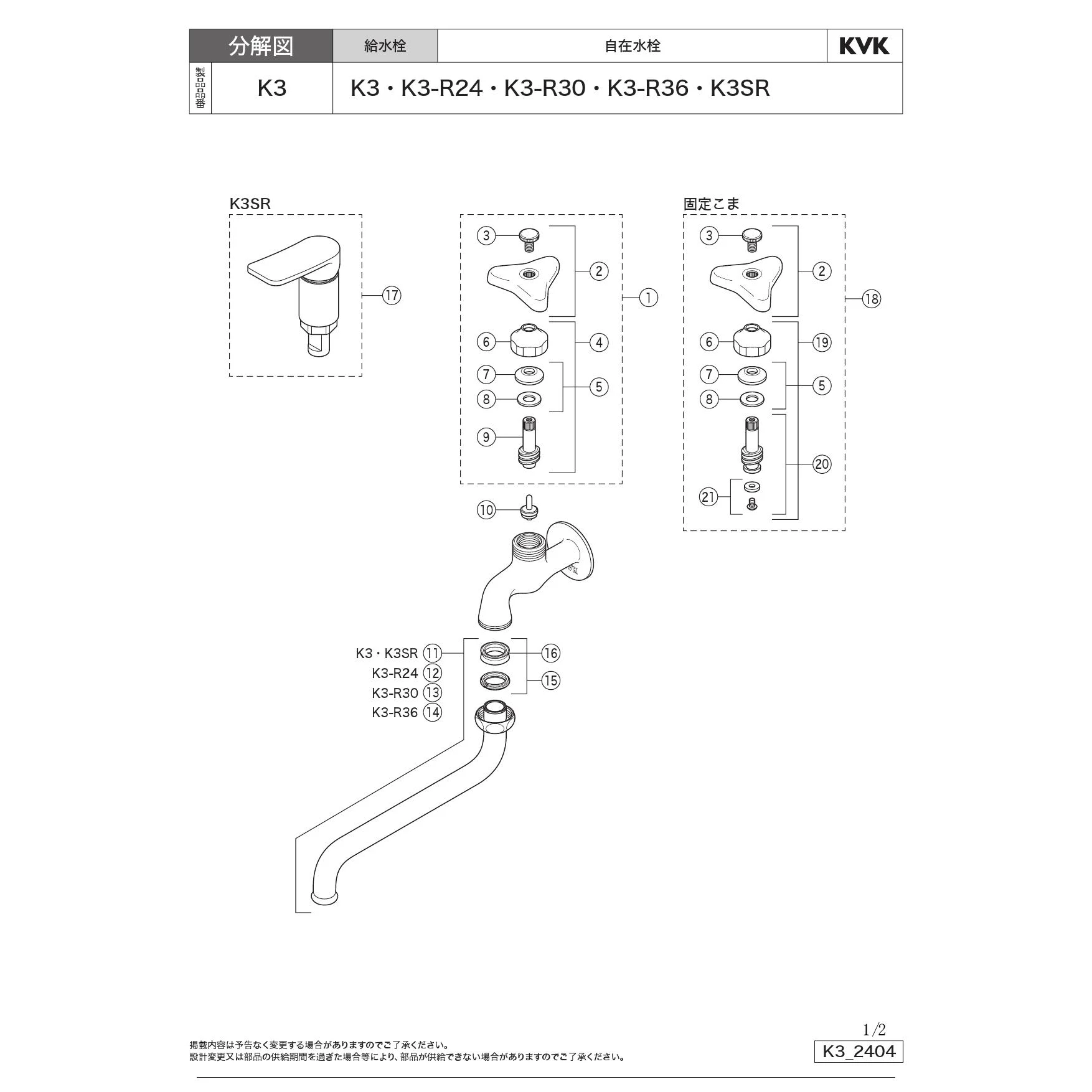 KVK K3SR 取扱説明書 商品図面 分解図