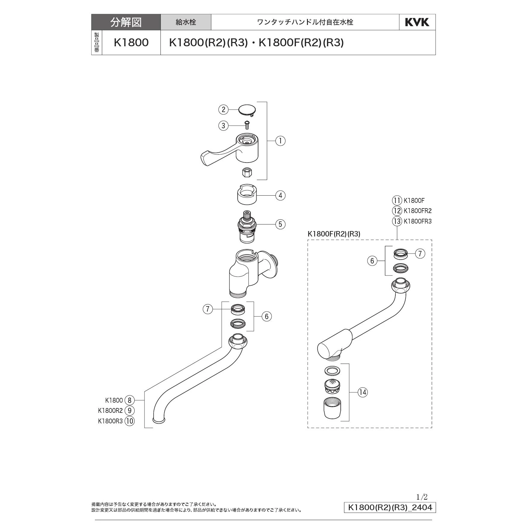KVK K1800 取扱説明書 商品図面 分解図