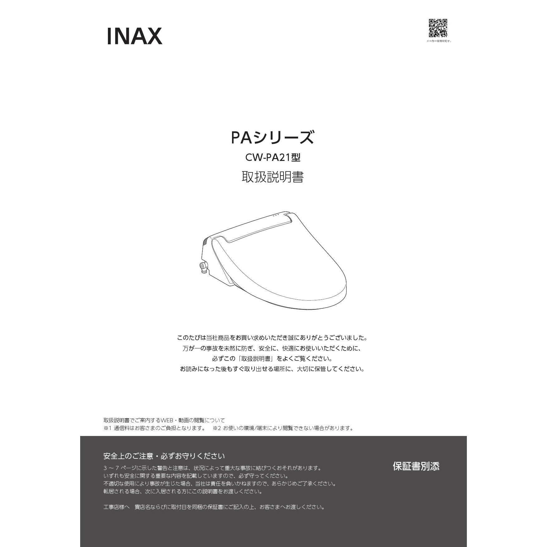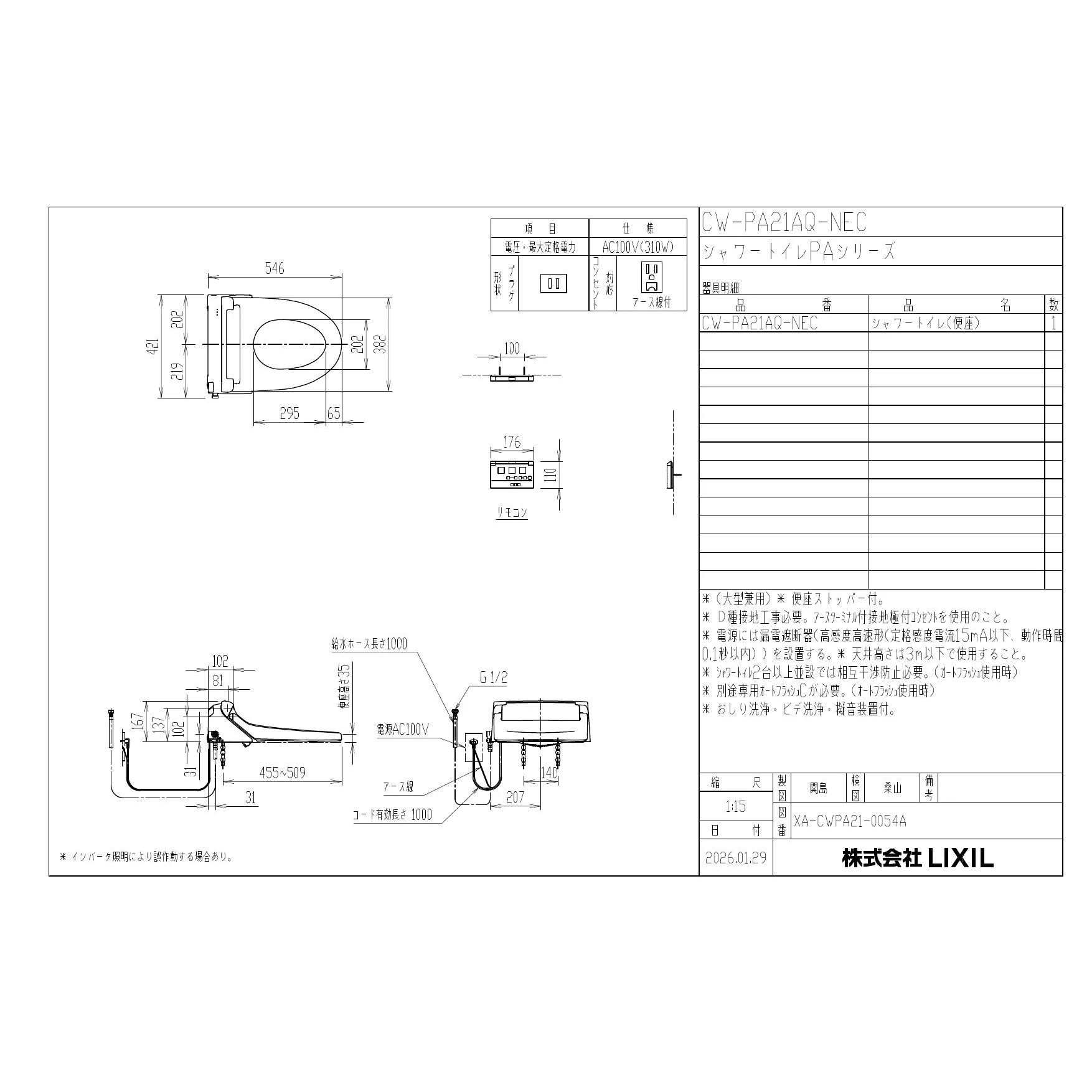 LIXIL(リクシル) CW-PA21AQ-NEC シャワートイレPAシリーズ 便フタなし仕様 取扱説明書 商品図面 施工説明書
