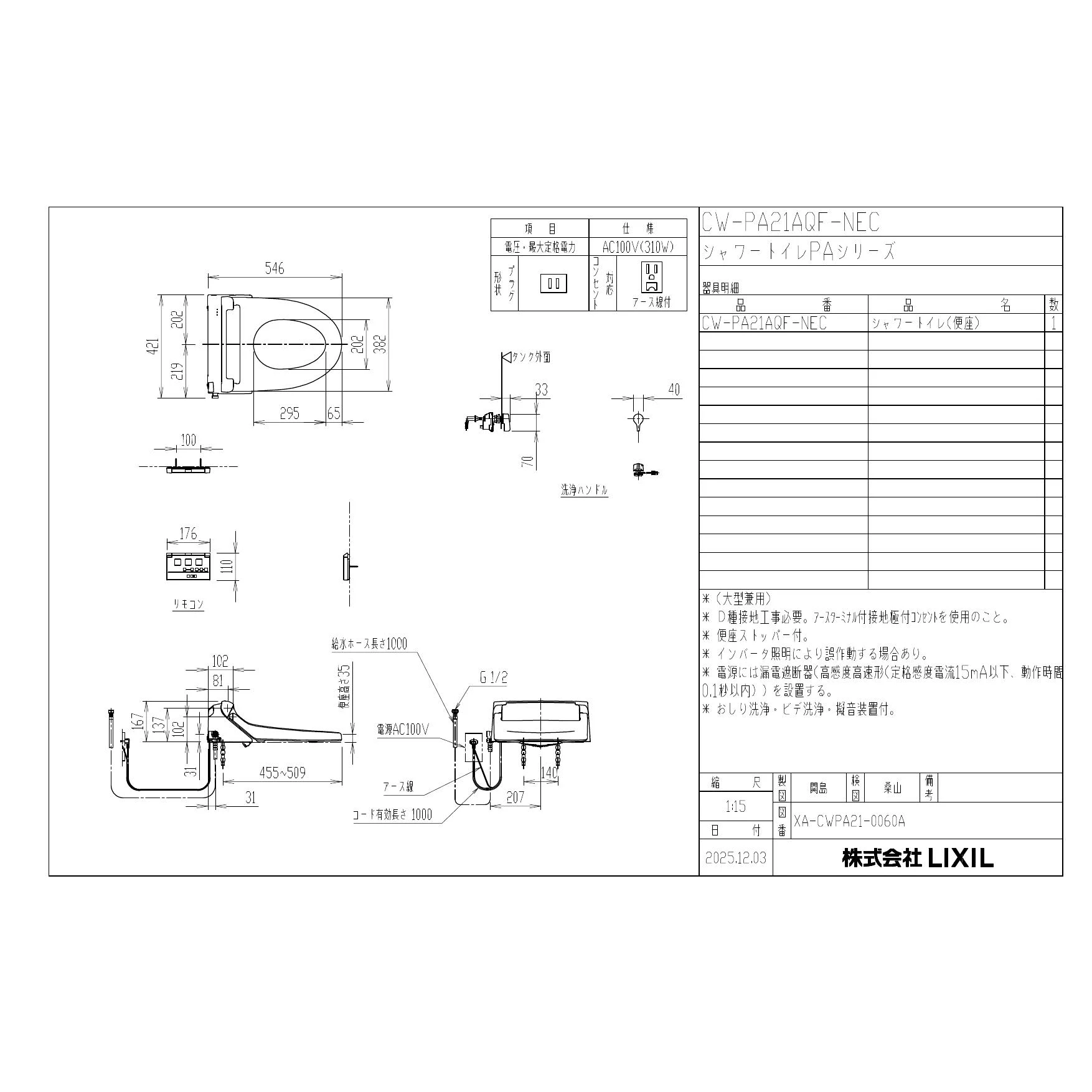 LIXIL(リクシル) CW-PA21AQF-NEC シャワートイレPAシリーズ 便フタなし仕様 取扱説明書 商品図面 施工説明書