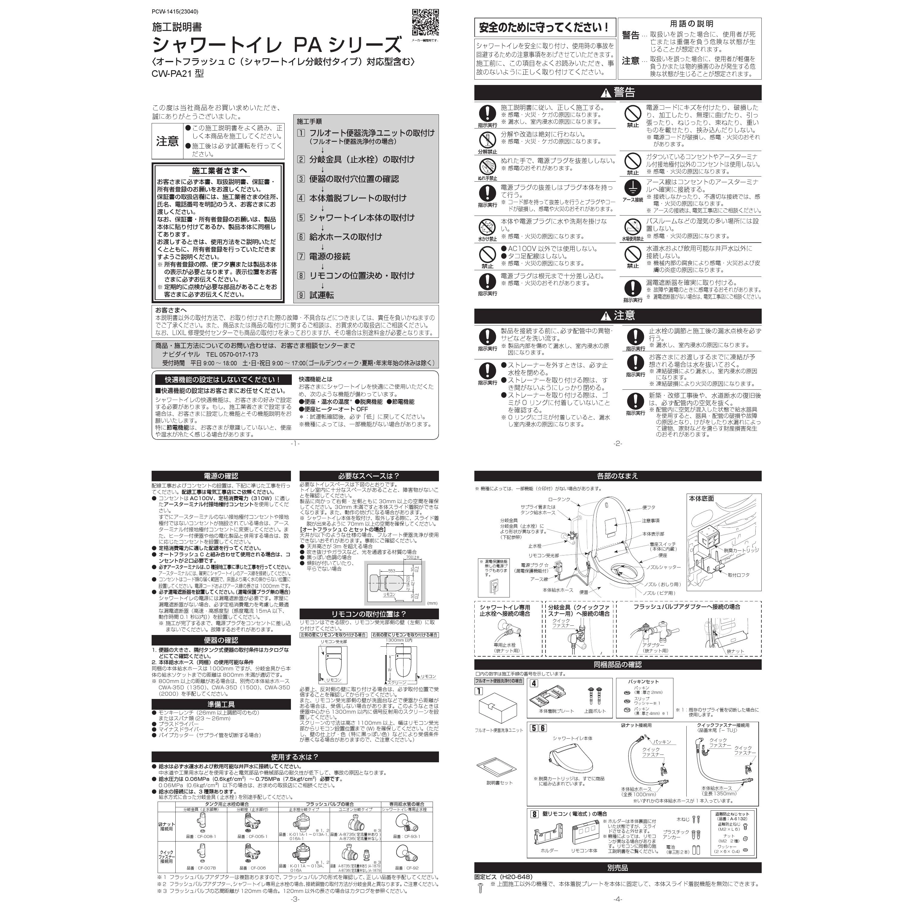 LIXIL(リクシル) CW-PA21AL-NEB シャワートイレPAシリーズ 漏電ブレーカー仕様 取扱説明書 商品図面 施工説明書